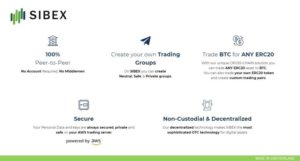 SIBEX is a Swiss decentralized protocol that allows you to trade OTC securely & privately and directly between Bitcoin and any ERC20 Tokens you wish using smart contracts.