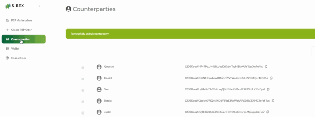 3. Click “Counterparties” and add the SIBEX ID of the person you are trading with.
